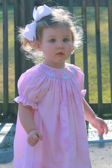 She loves basketball. She really loves all kind of ball but we have a basketball goal in our back yard and she is exposed to that sport the most right now, so she talks about it more than the others. Hopefully, tennis will take its place down the road, but I love basketball too, so it's fine! :) We are very big Alabama fans (as if you didn't know), so Anna Scott hears about Bama a lot. Every time she makes a basket (on her little goal or bath tub goal) she claps her hands and yells, "Yea Alabama!" or "Yea Nick Saban!" It is the funniest thing! We did not teach her to say "Yea Nick Saban." She just associates him with Alabama and says his name too. :) I am excited about the upcoming football season. She is going to love cheering for the Crimson Tide.